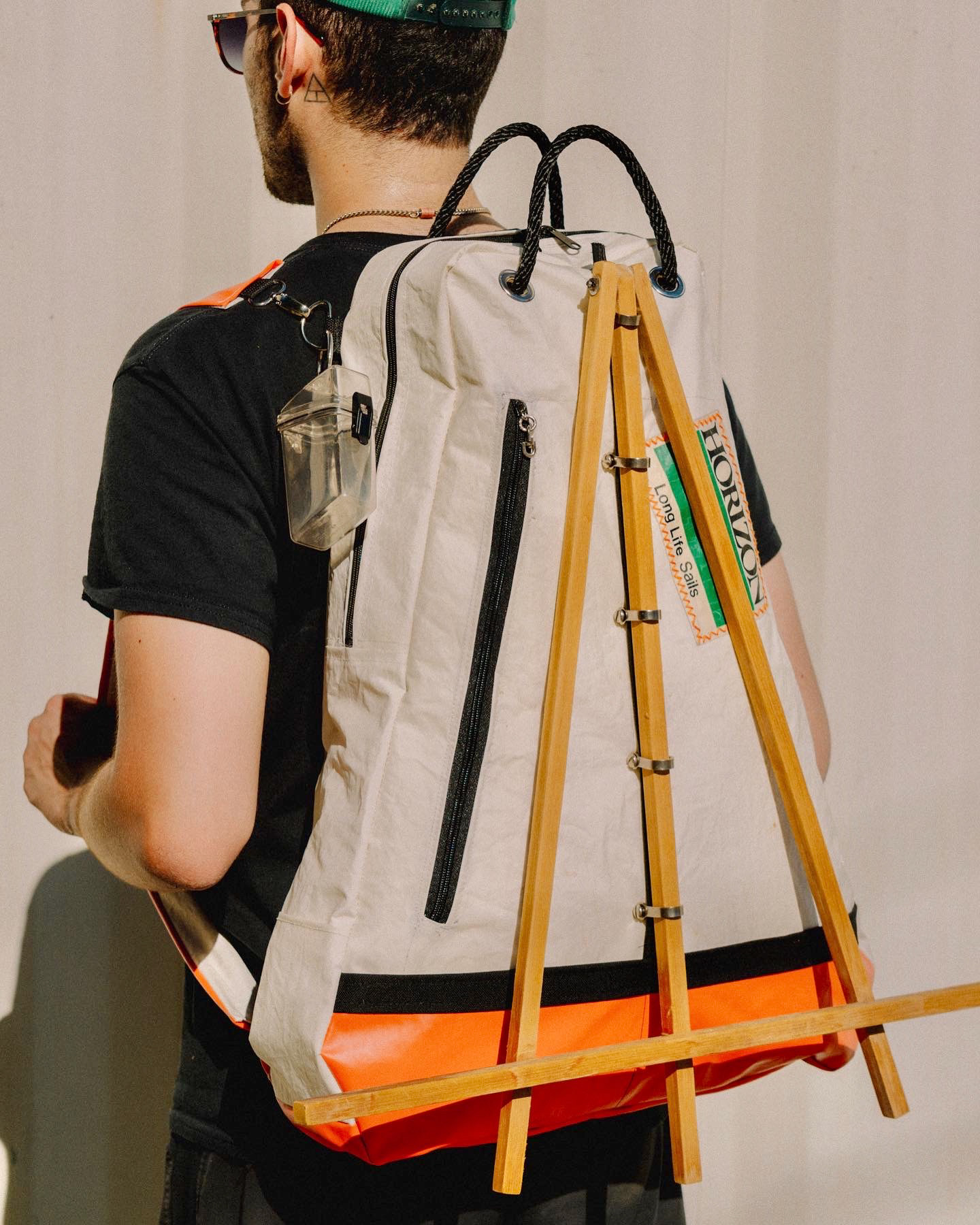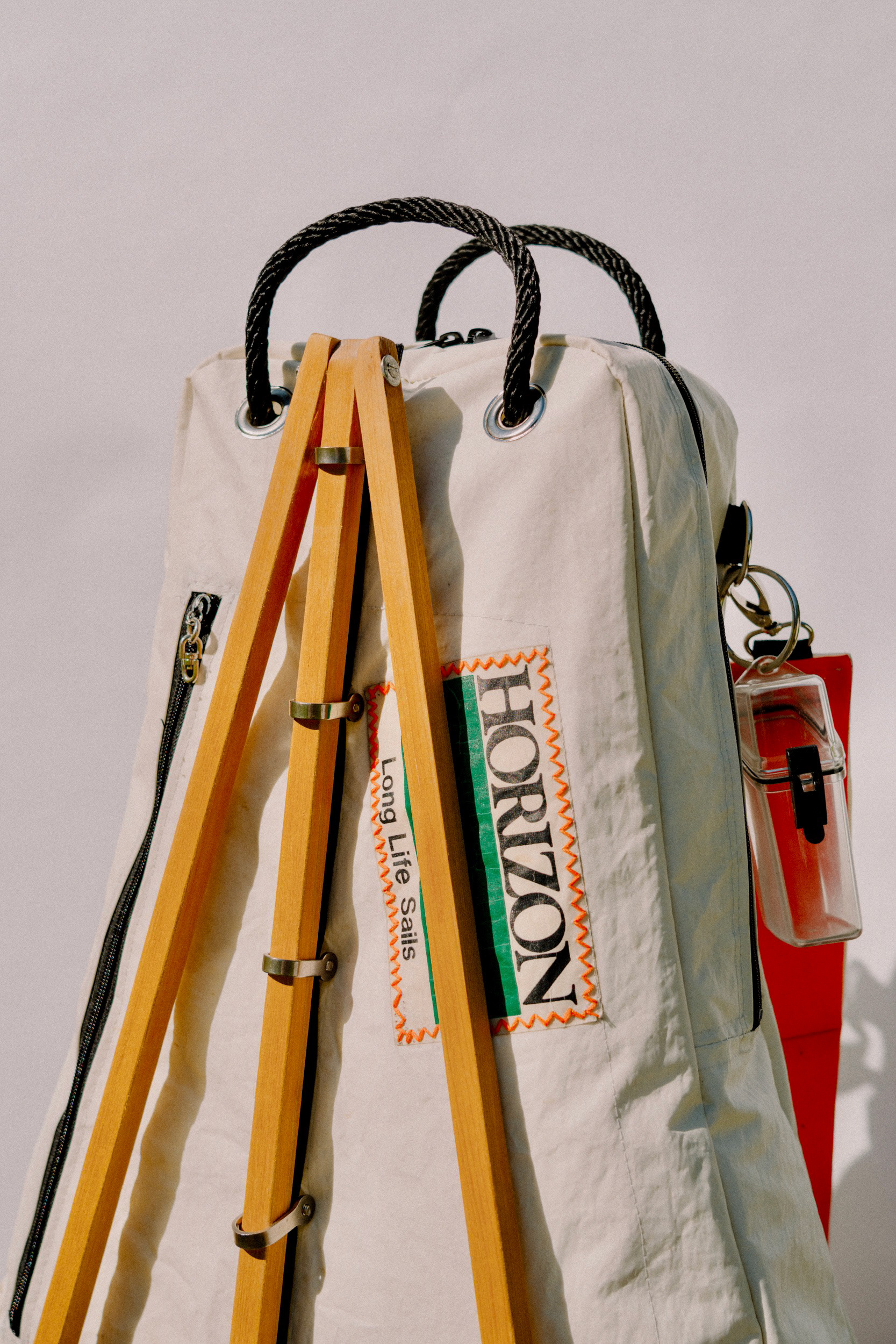 TRIPLE POCKET STORAGE, DETACHABLE EASEL + STRAPS, ORIGINAL SAILING HARDWARE, CONSTRUCTED FROM RECYCLED SAILCLOTH + RAINCOAT MATERIALS