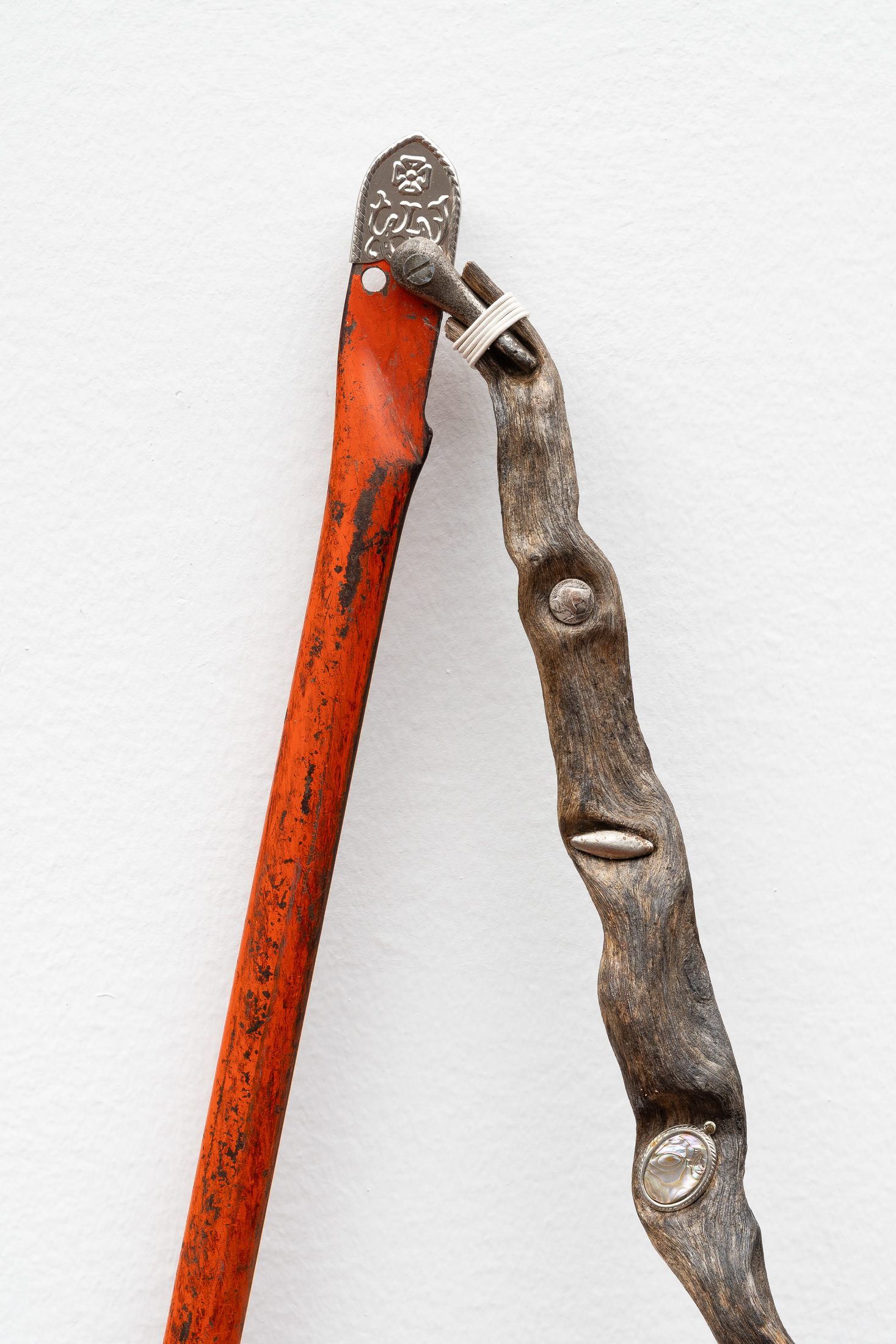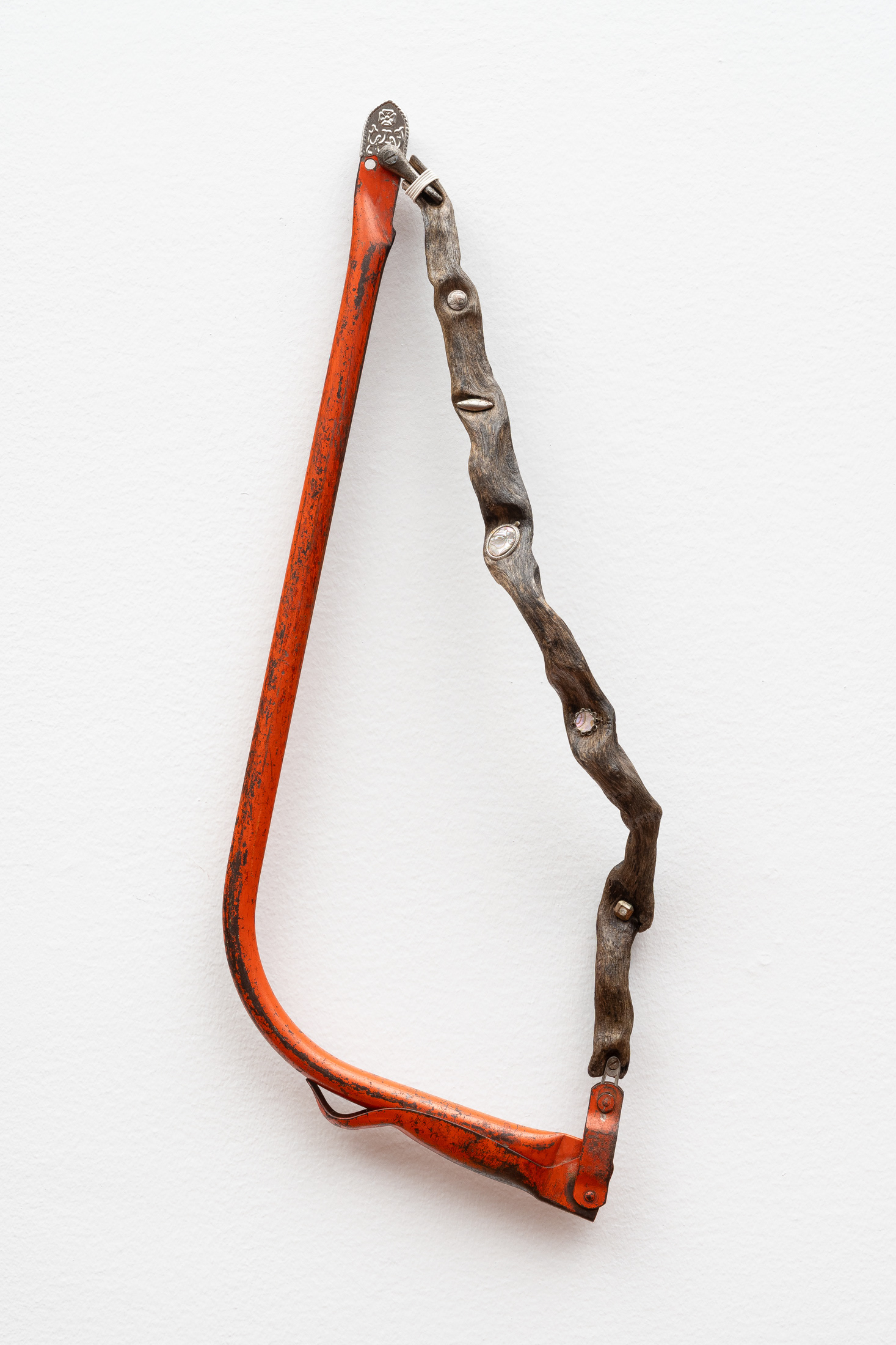 Bow-cut saw handle, driftwood, electrical wire, stainless steel accoutrements, aluminum belt tip, zipper pull