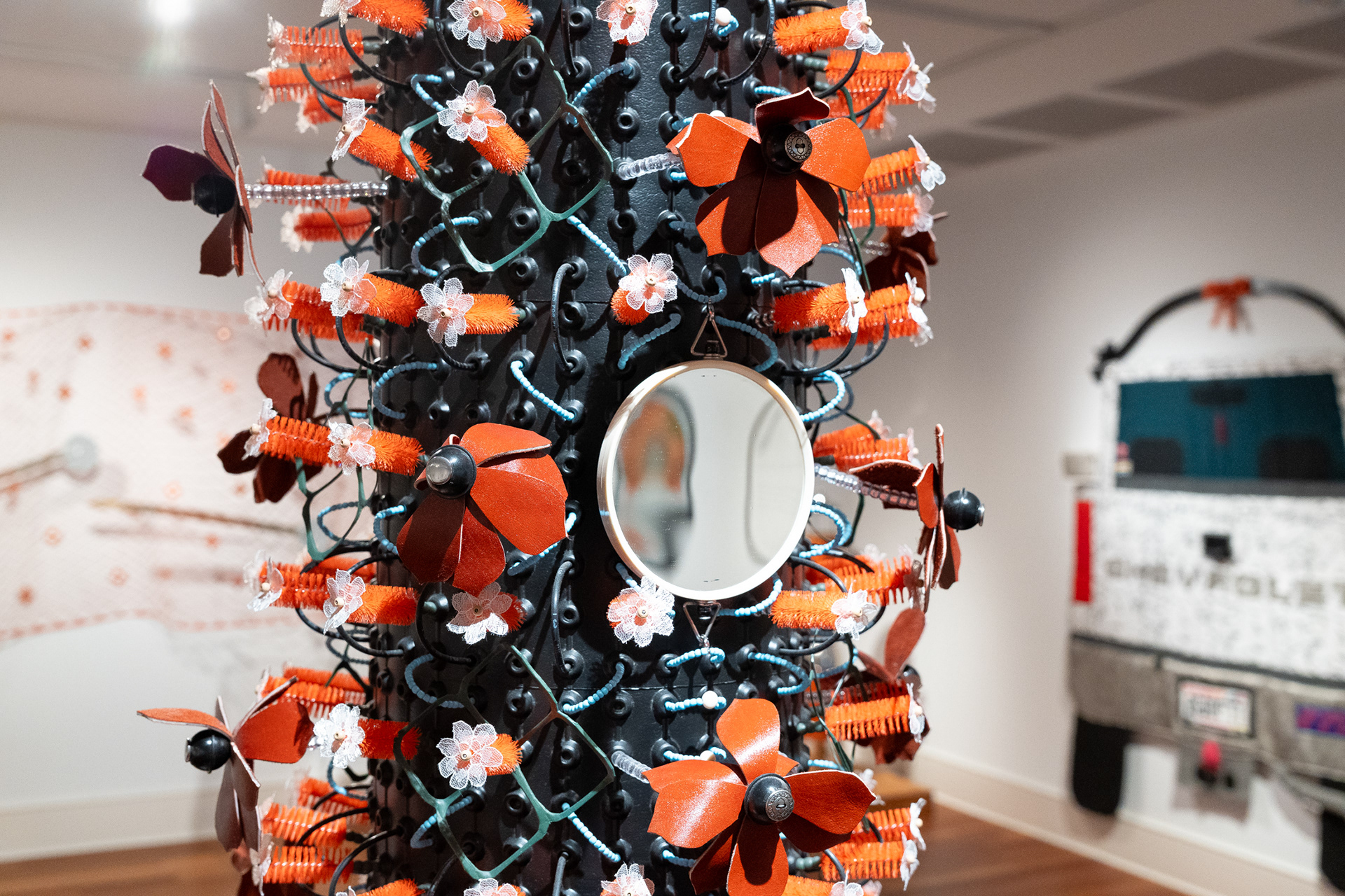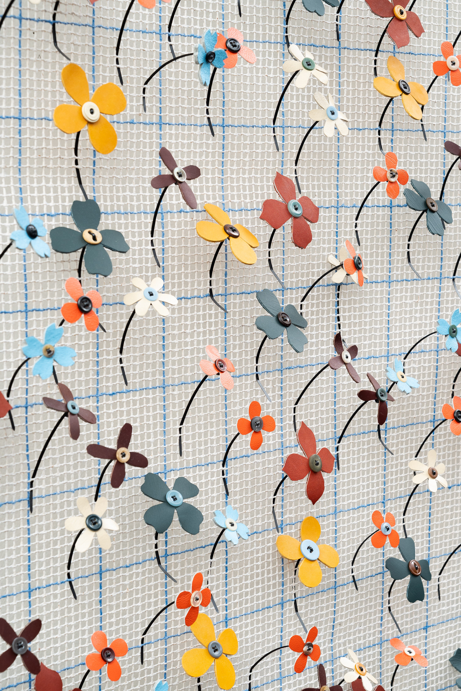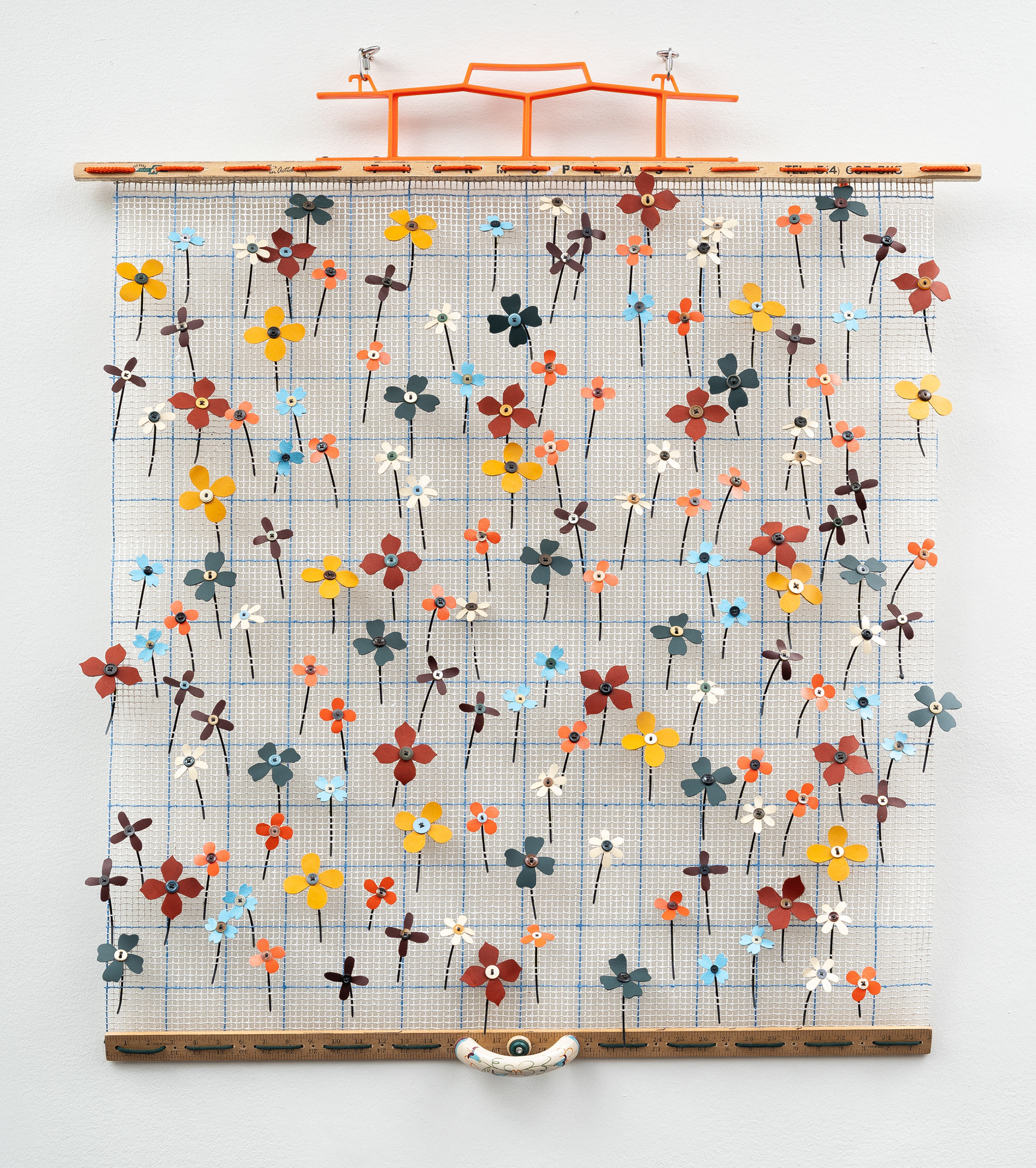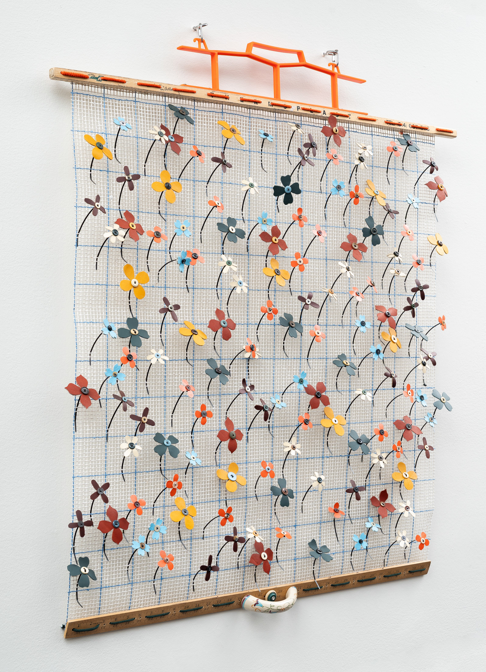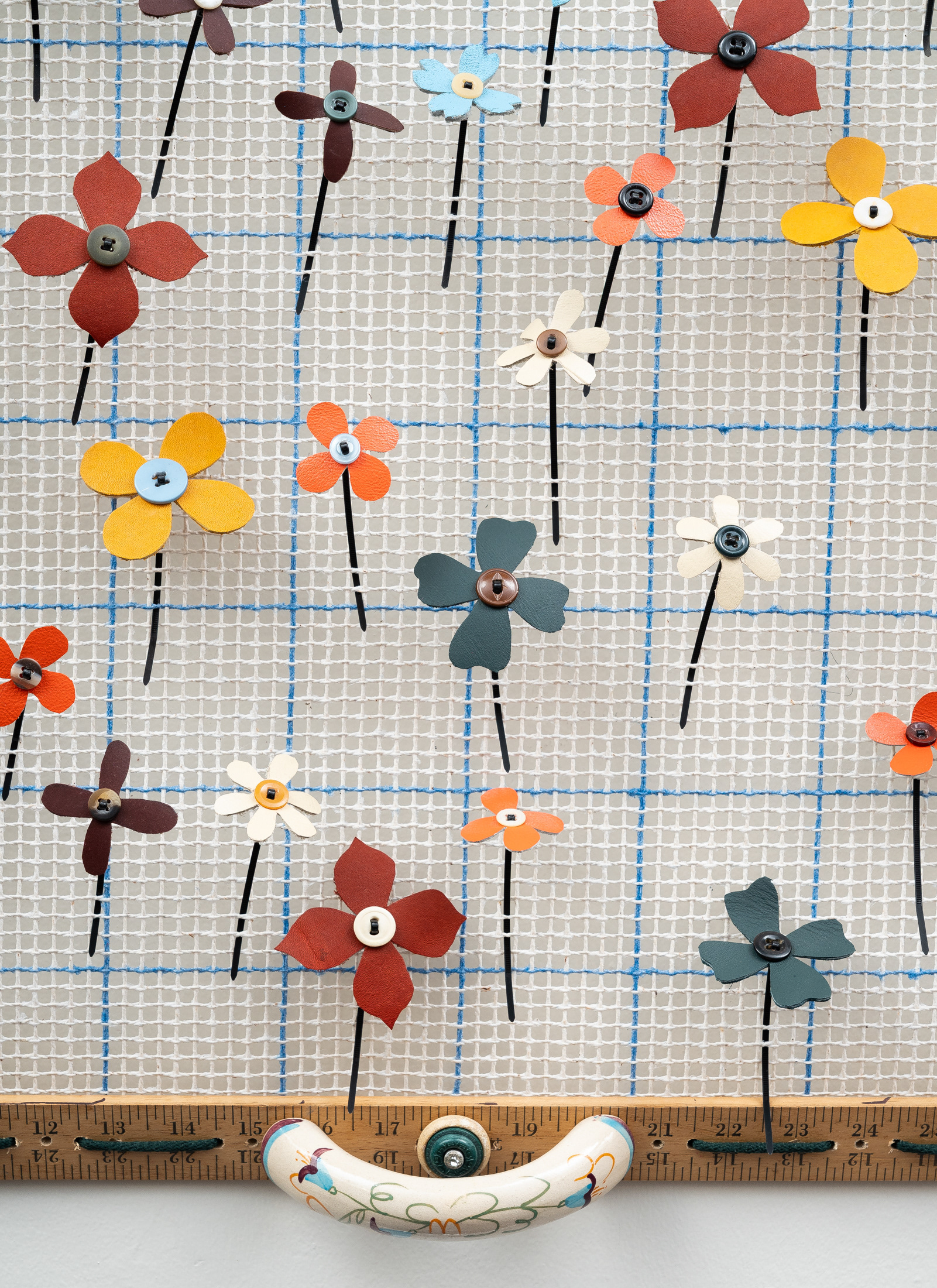 Twine rug canvas, plastic cord winder, hand-cut leather flowers, garment buttons, wooden yardstick, polyester cord, ziptie, ceramic handle, stainless steel hardware