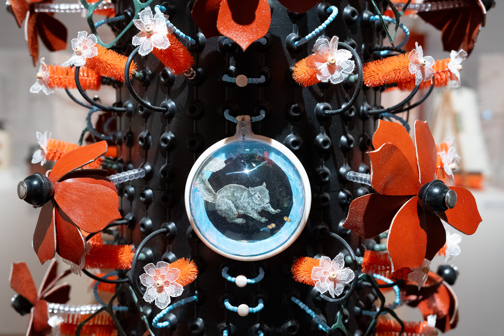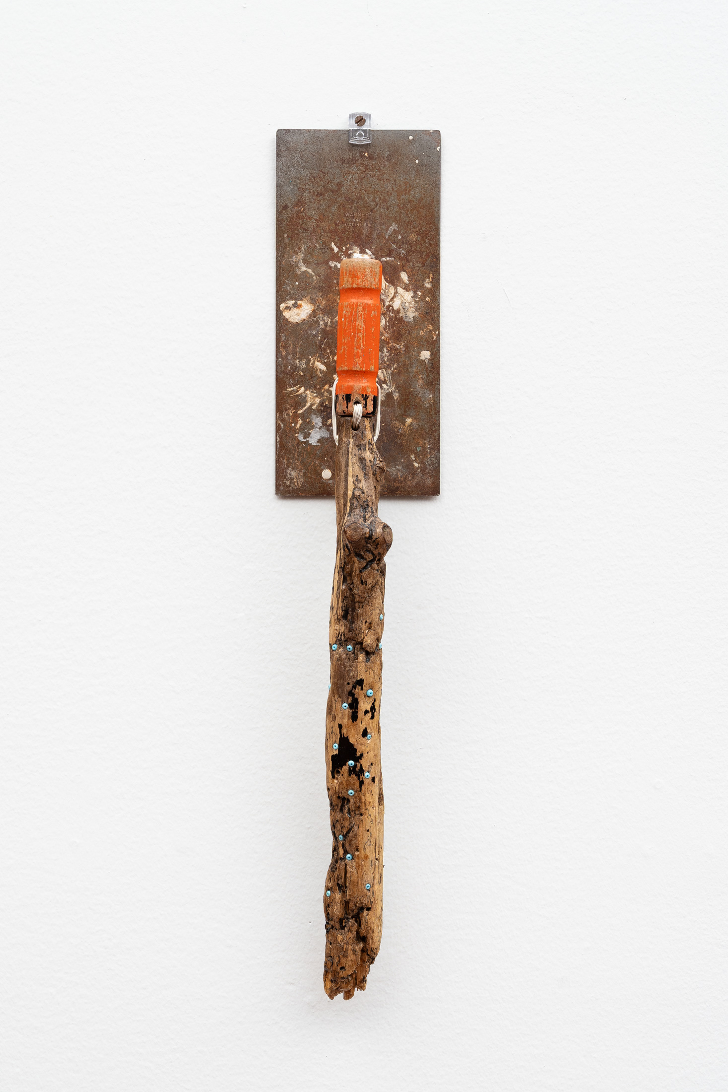 Steel plaster tool, driftwood, electrical wire, glass bead