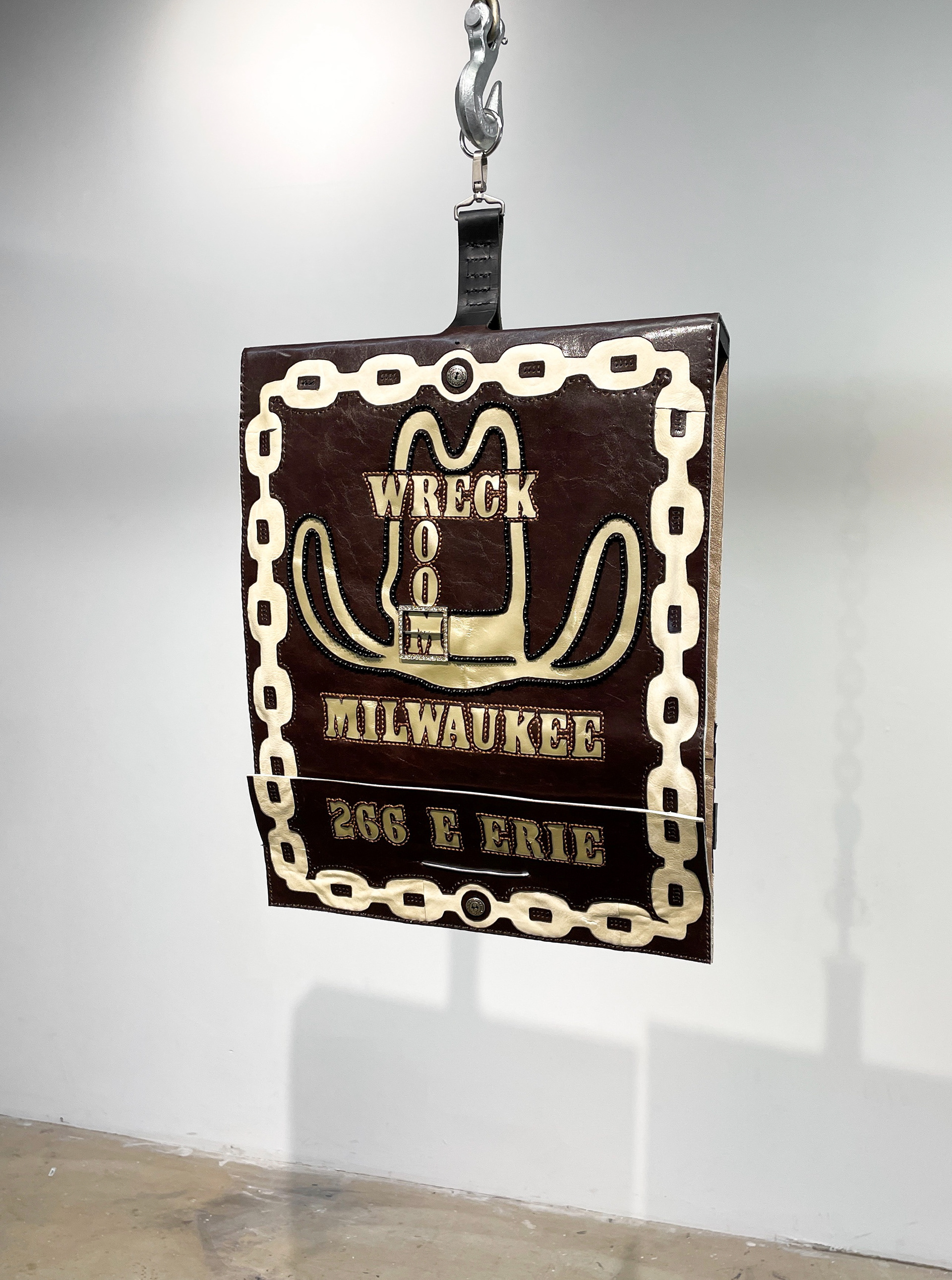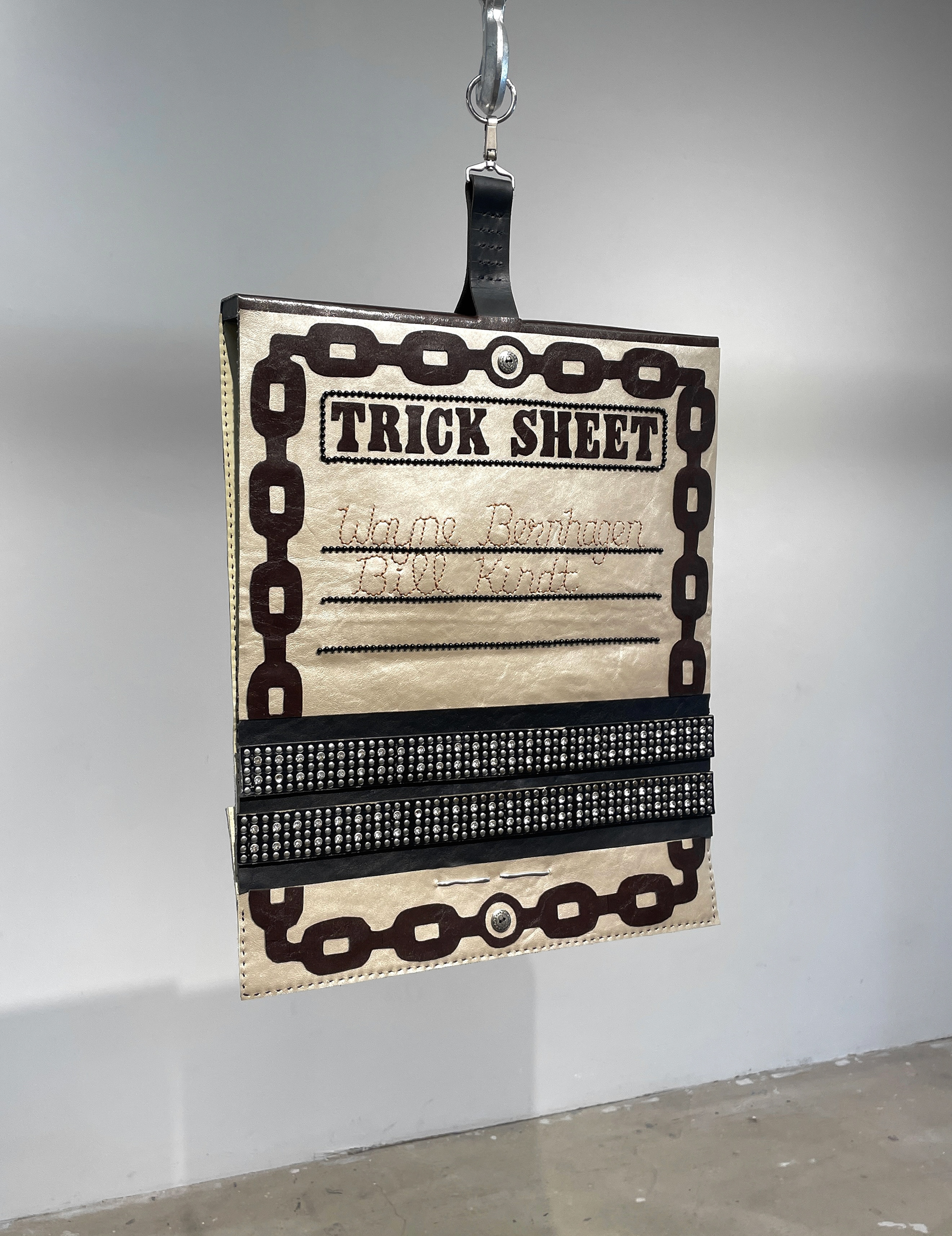 Painted metal seagull, karate belt, cowhide leather, wire