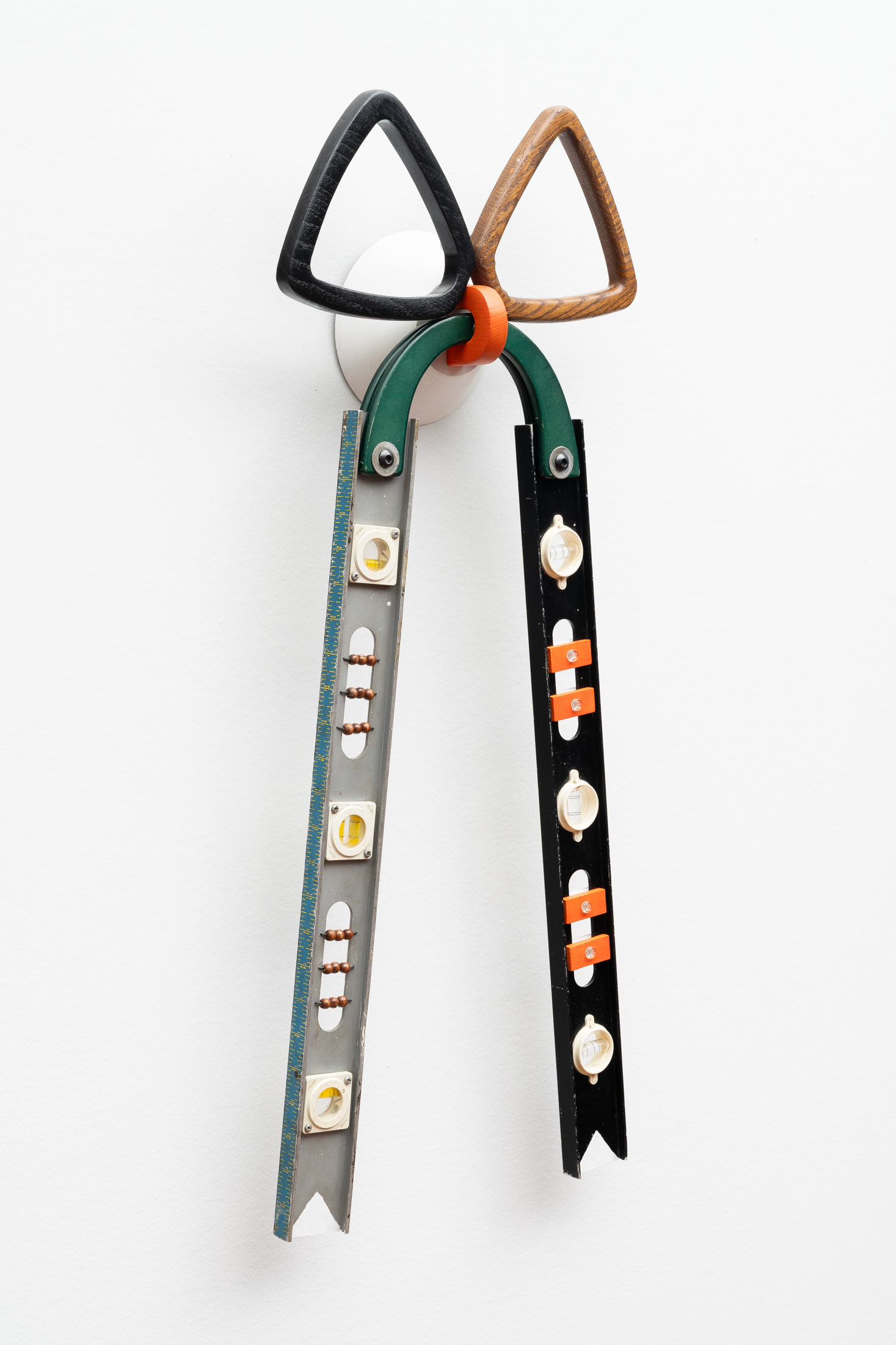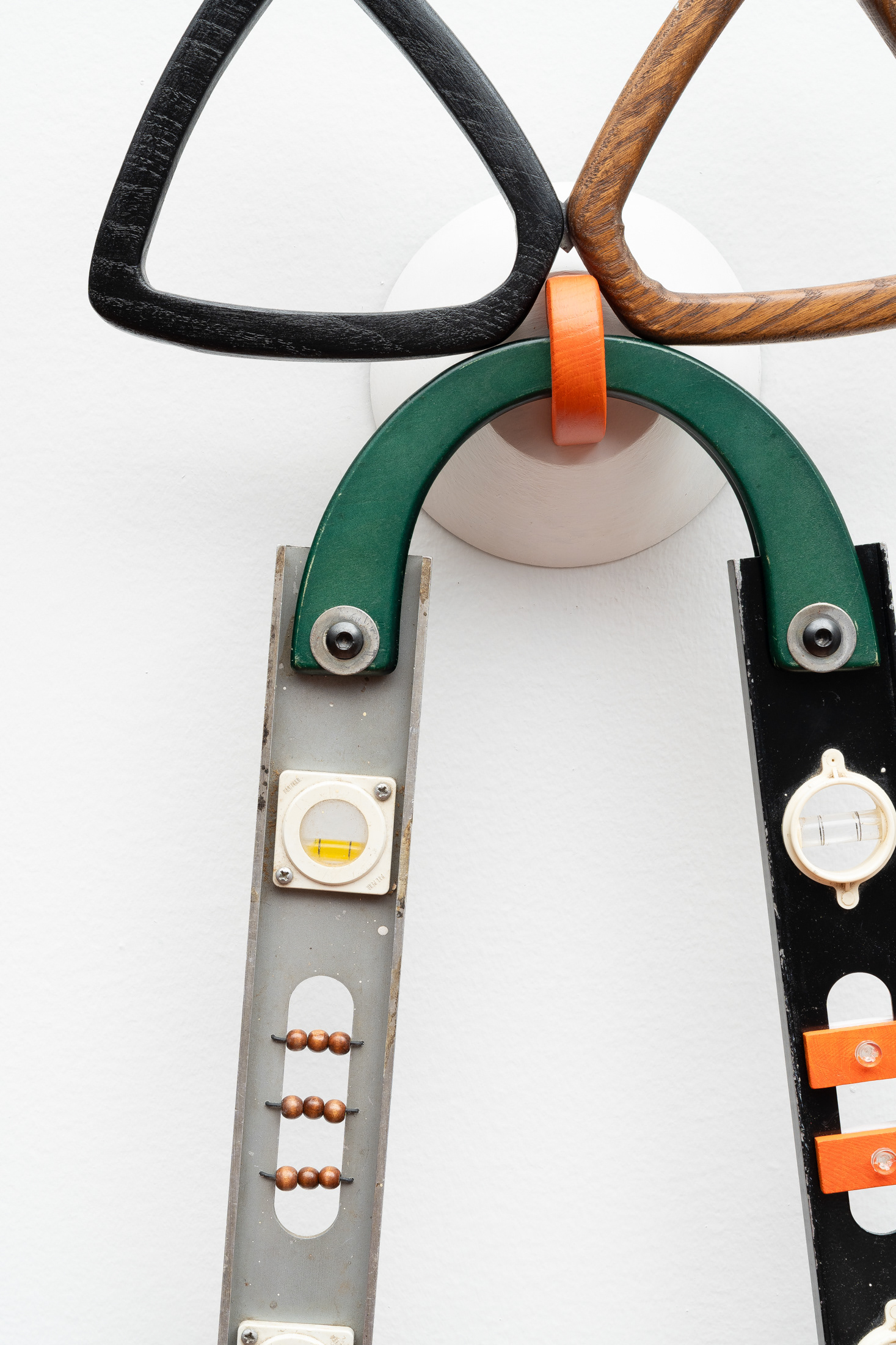Aluminum level, bamboo bag handle, wooden towel ring, wooden domino, wooden bead, wooden bowl, speaker wire, plastic nut + bolt, stainless steel hardware, acrylic paint