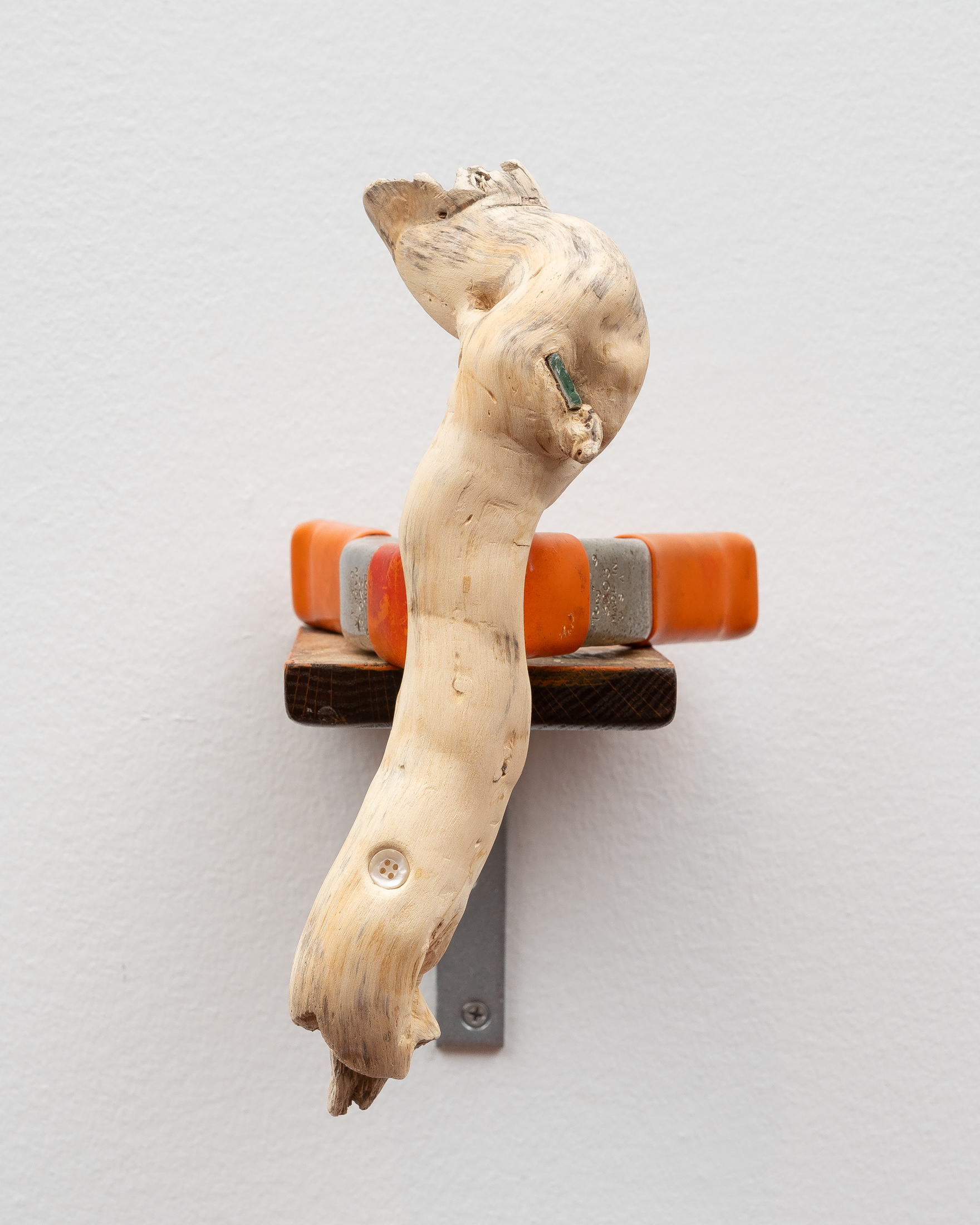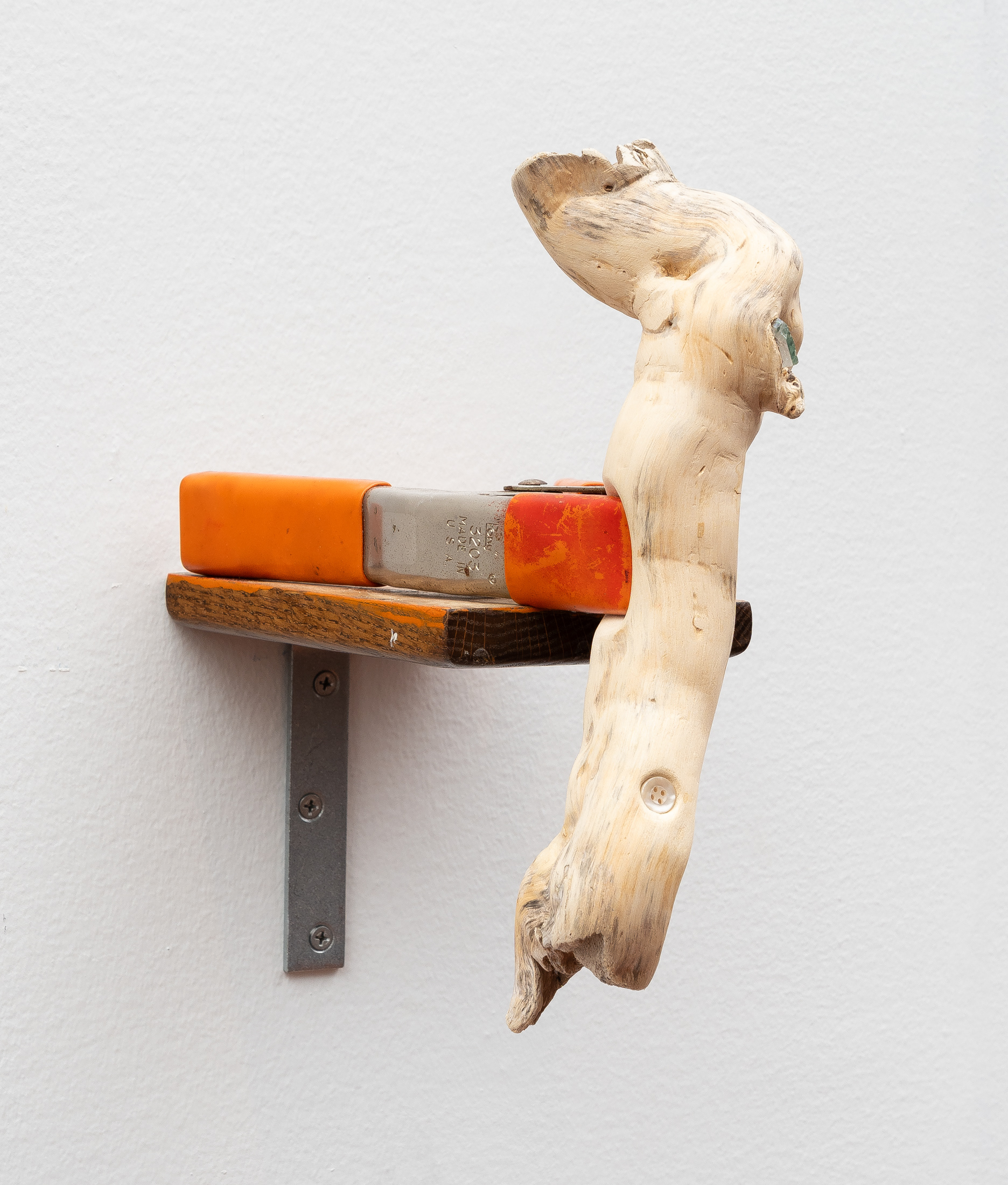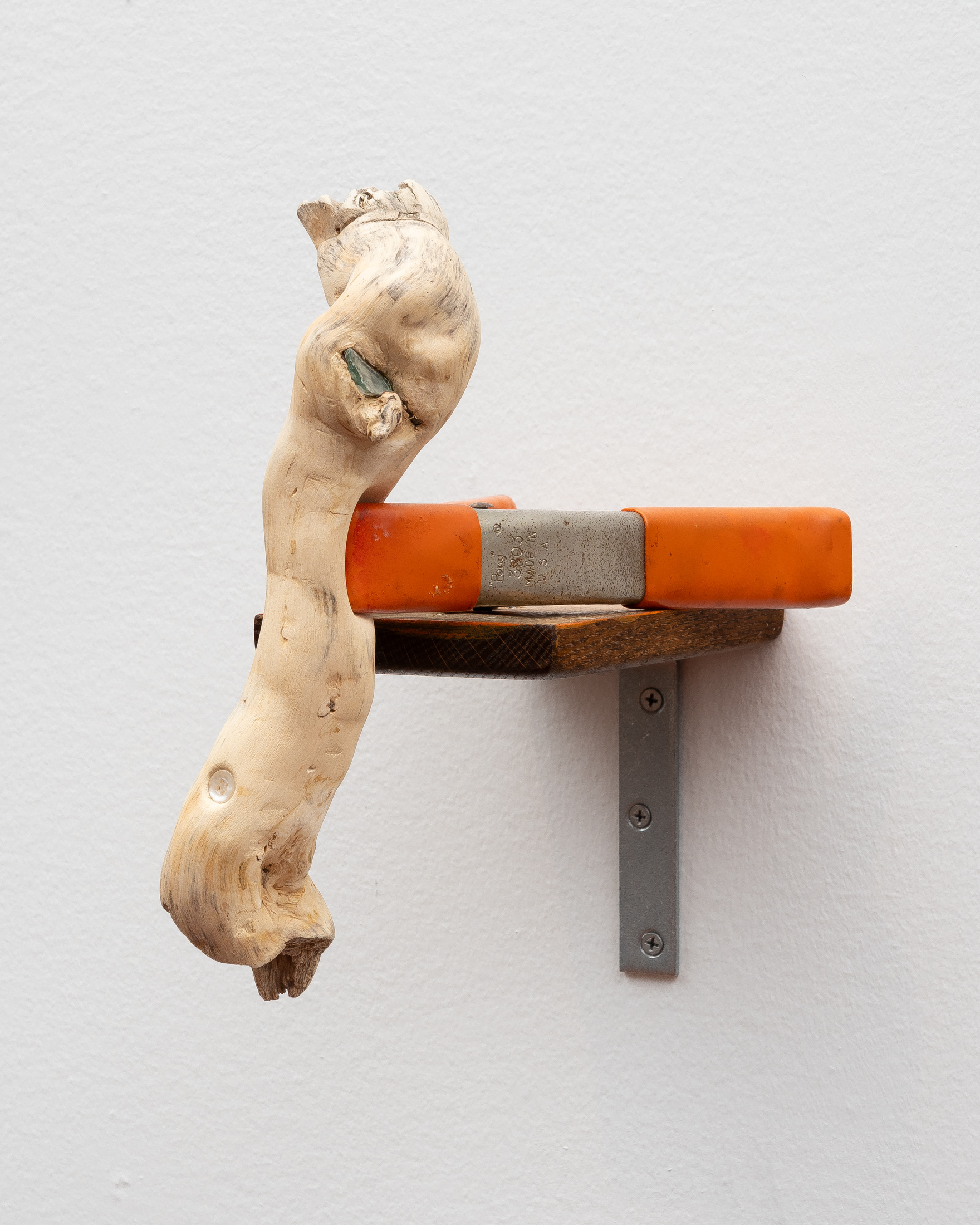 Driftwood, steel clamp, rubber grips, garment button, fluted glass, wooden shelf, steel bracket