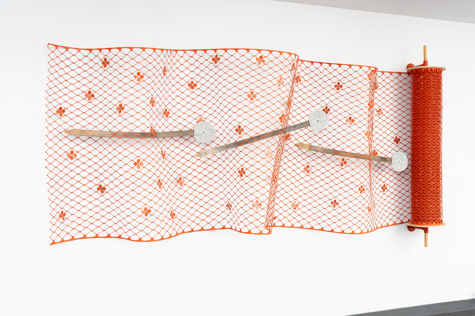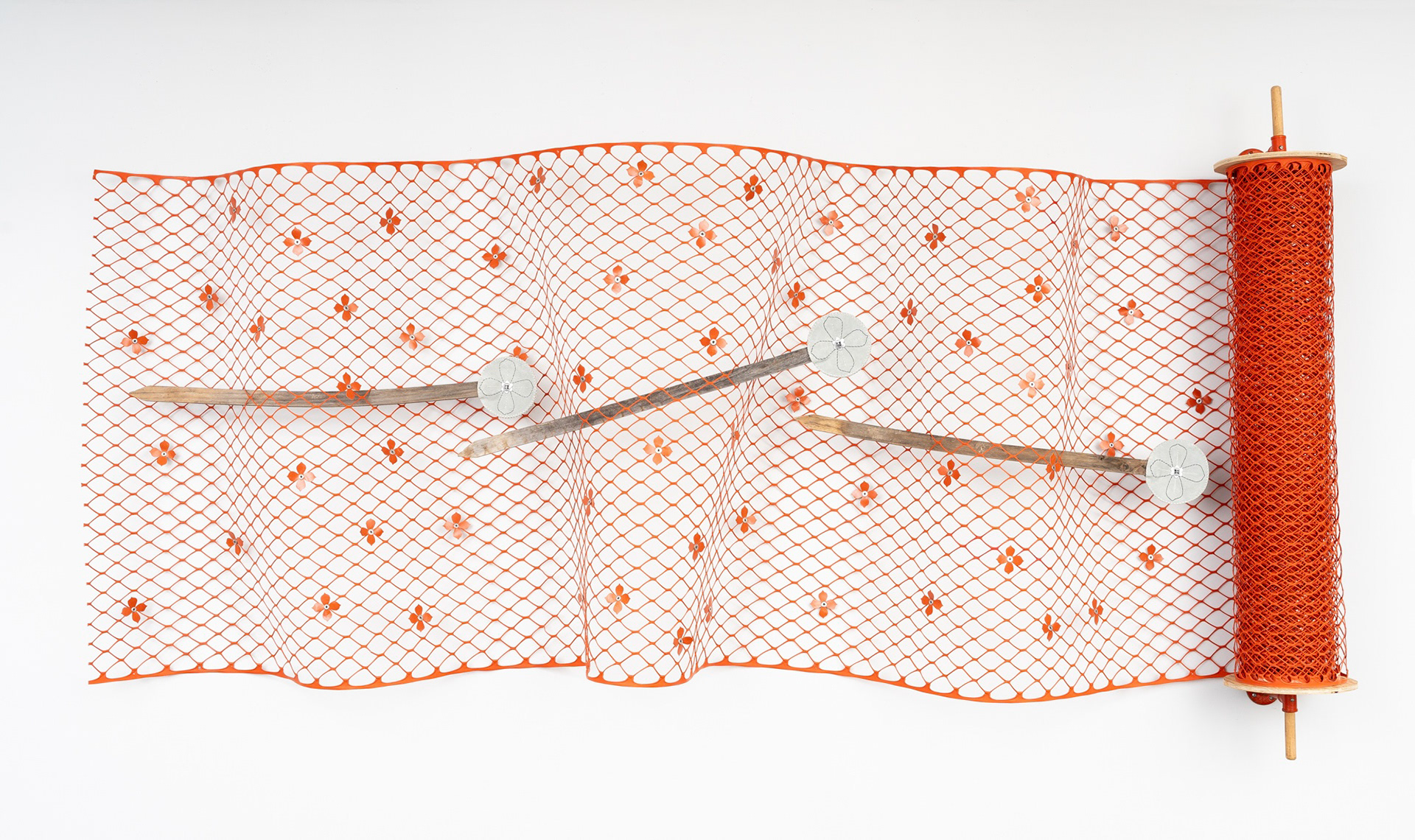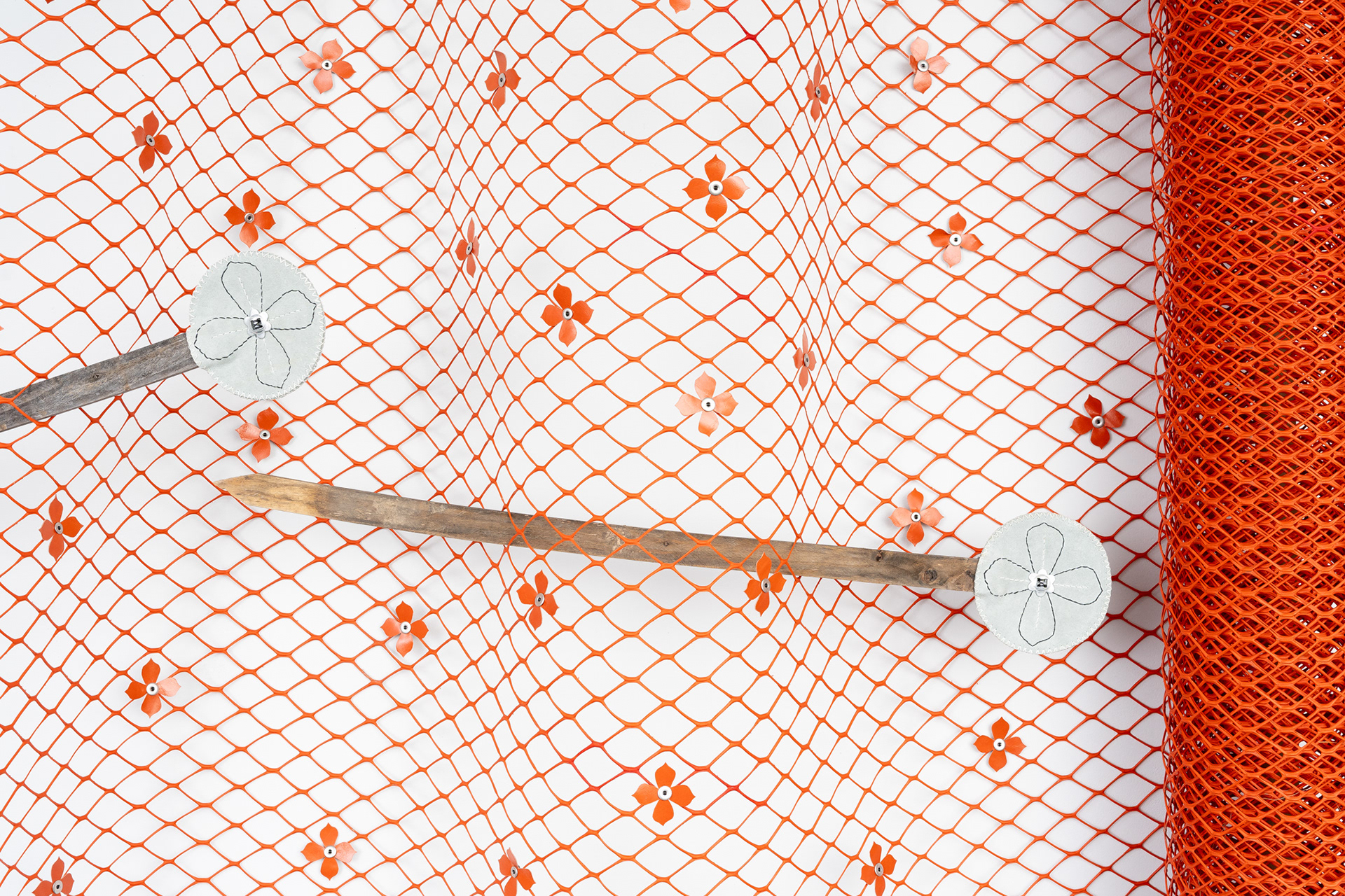 Plastic snow fencing, wooden stakes + dowels, cowhide leather, aluminum buttons, cast iron brackets, zip-ties