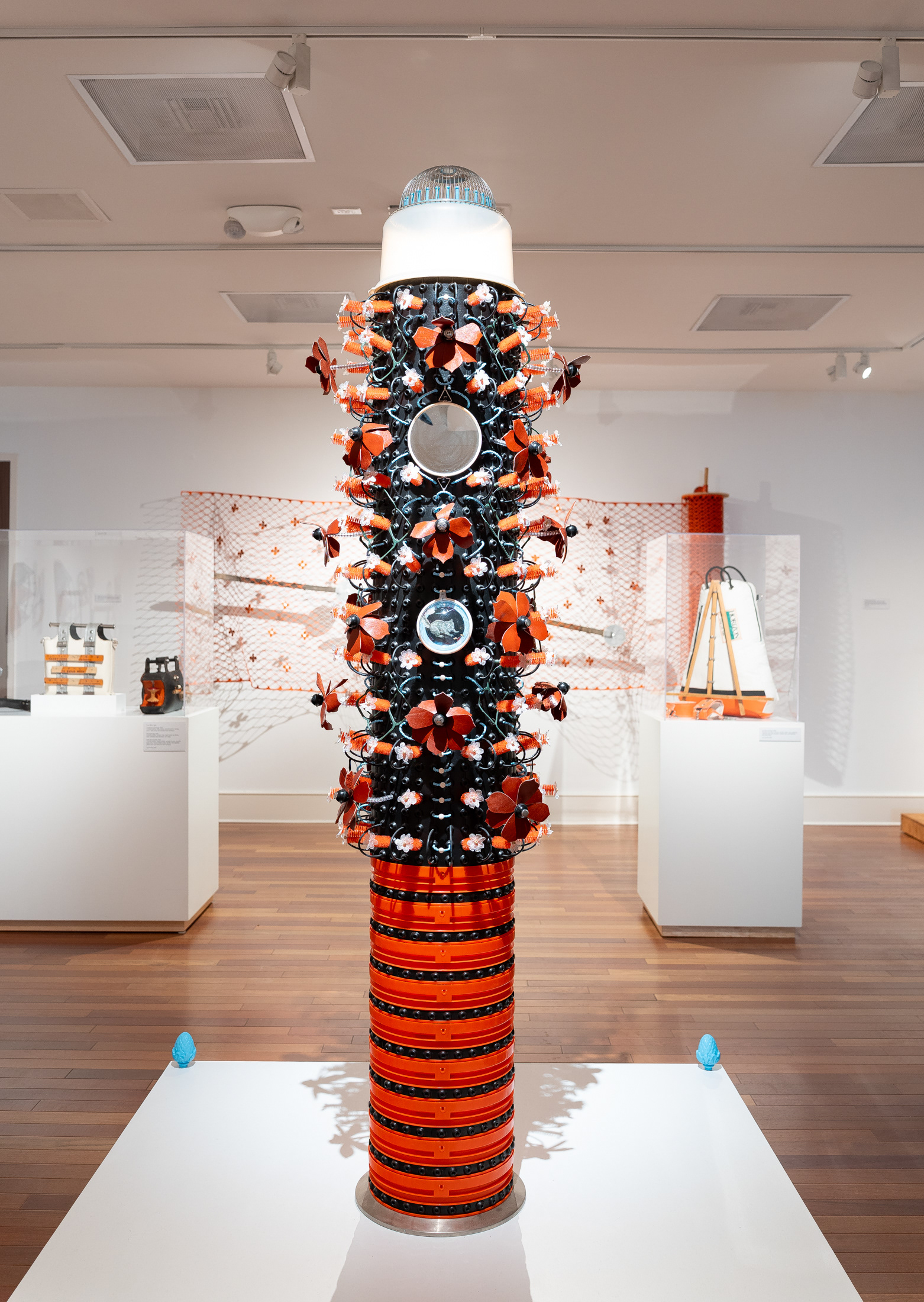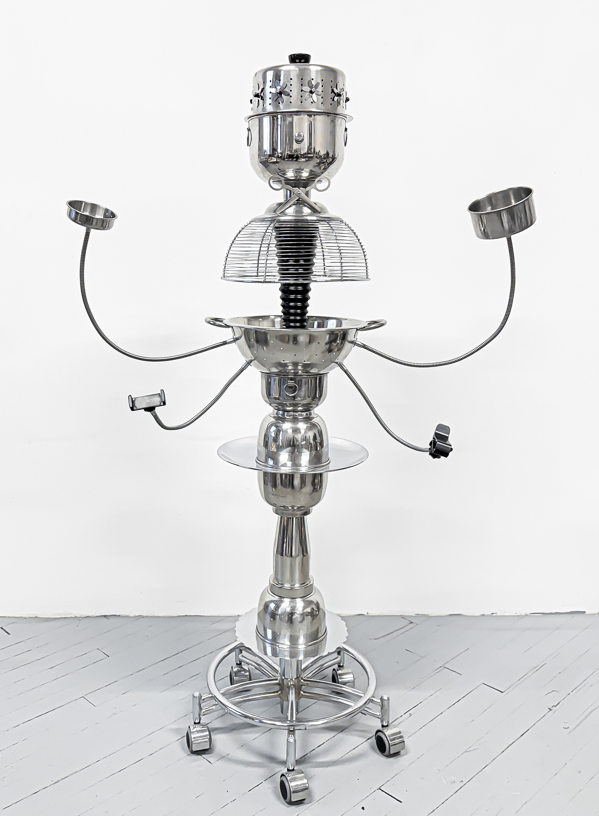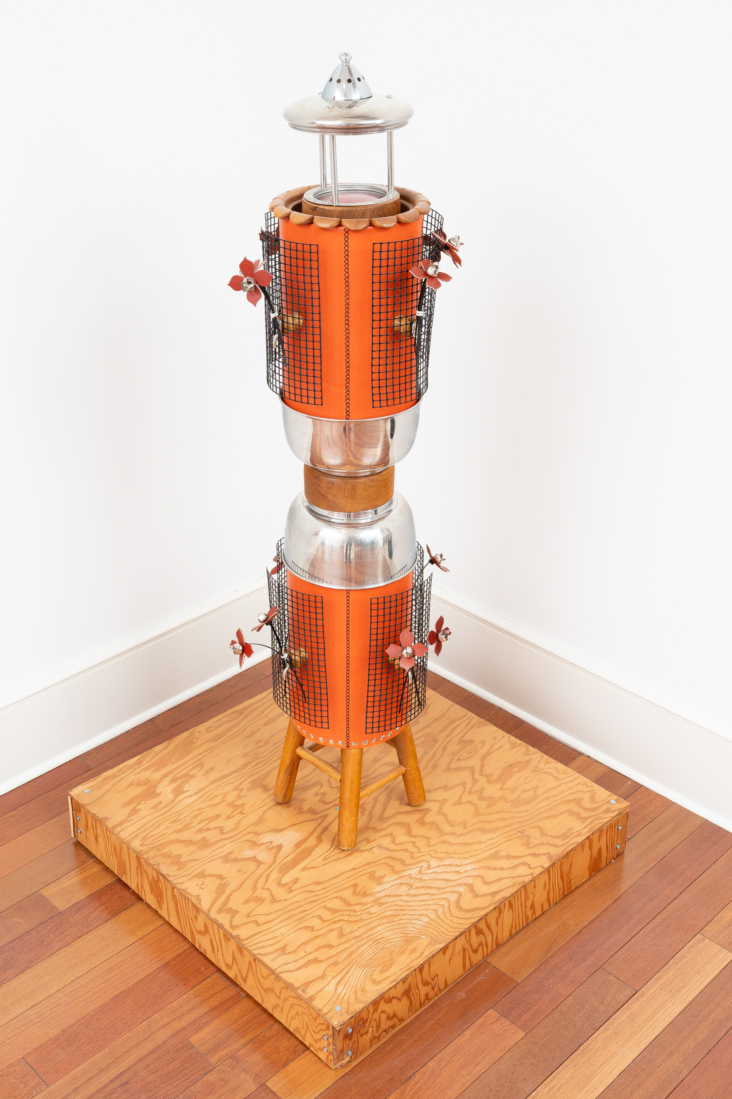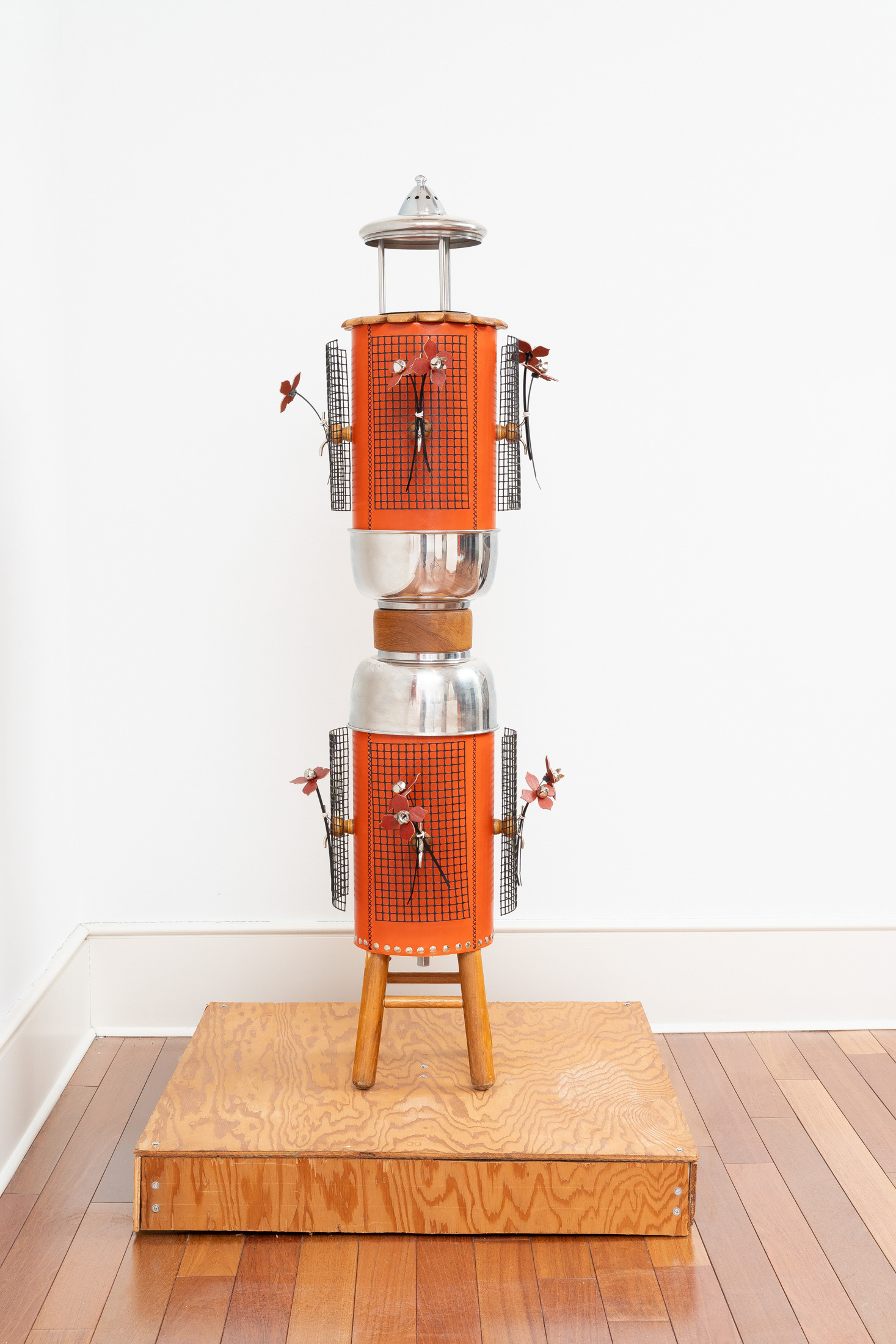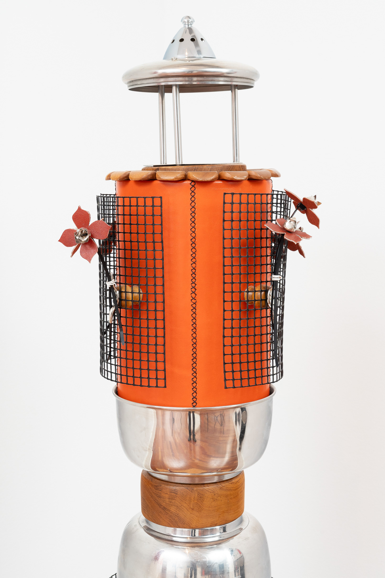 Wooden stool base, teak bowls, waxed pigskin leather, plastic garden fencing, wooden cabinet knobs, stainless steel mixing bowls, chrome rods, construction tubing, pot lid, vehicle taillight, flagpole cleats, threaded rod, stainless steel rivets