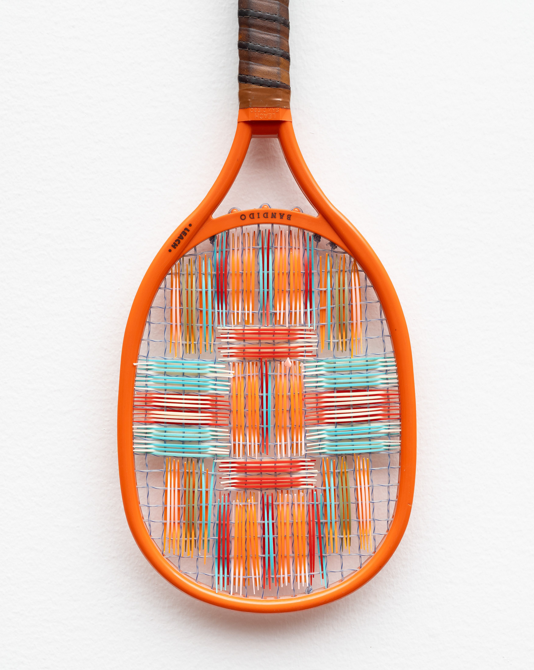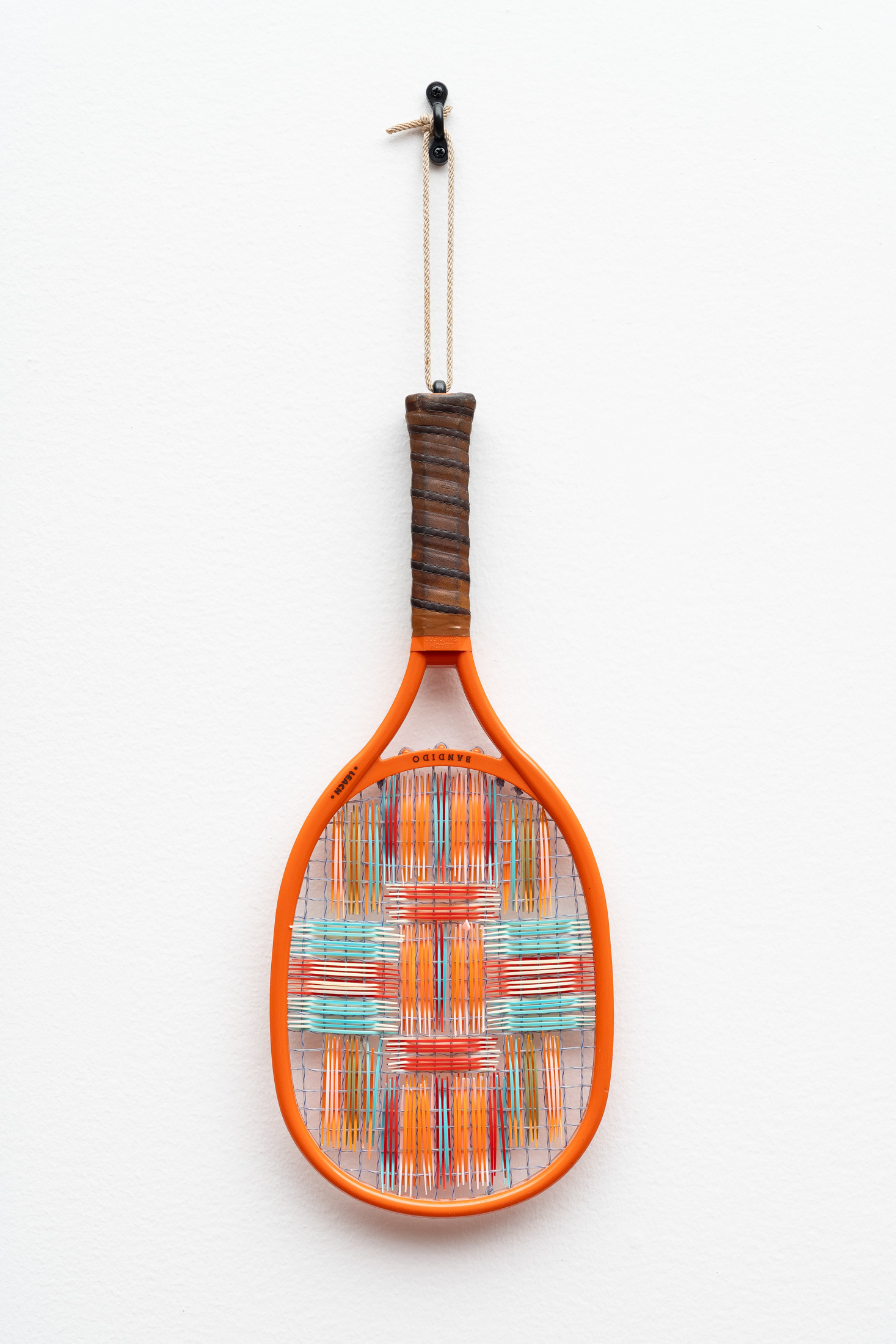 Tennis racket, plastic toothpicks, rope