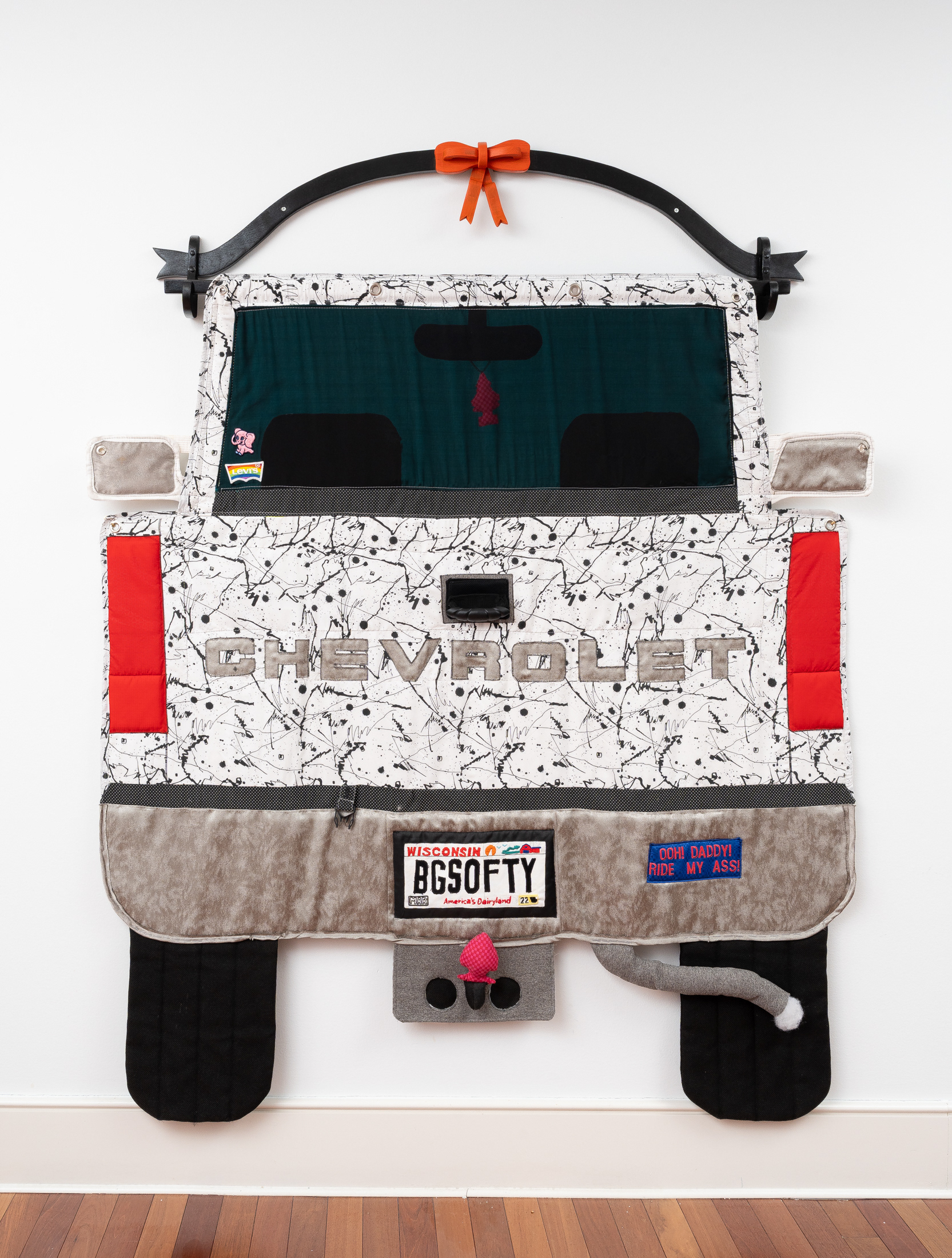 Quilted denim, hand-cut leather, plastic putty knives, garment buttons, windshield scraper, pinewood frame
