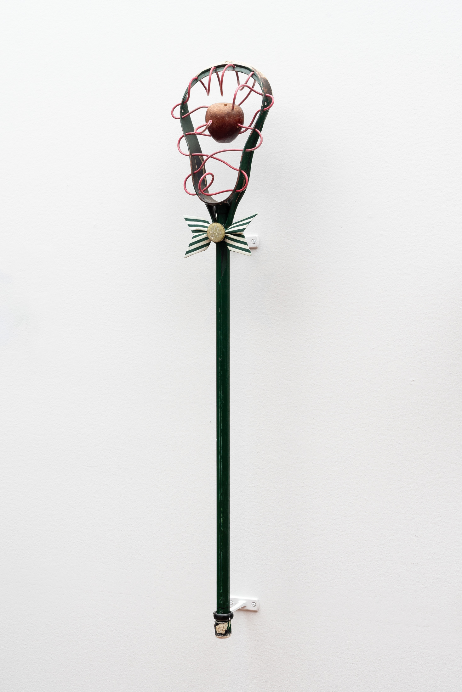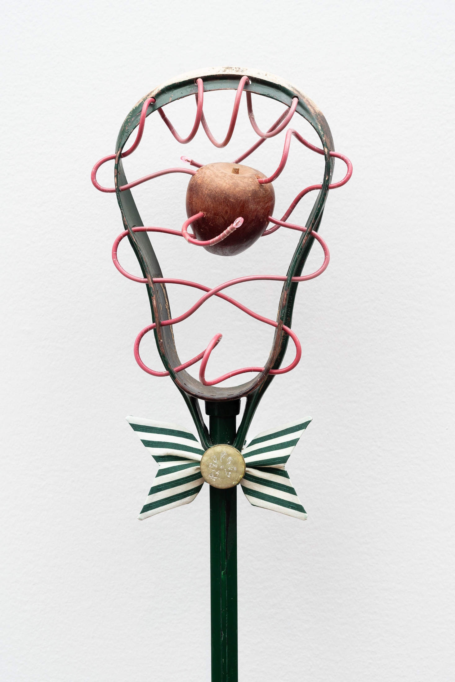 Lacrosse racket, wooden apple, electrical wire, handmade bowtie, faux crystal button, plastic bead